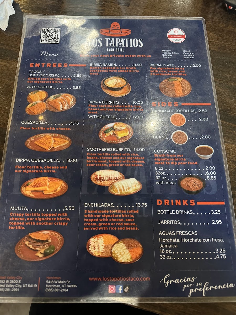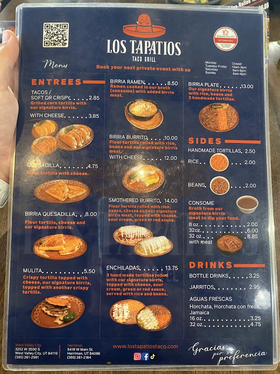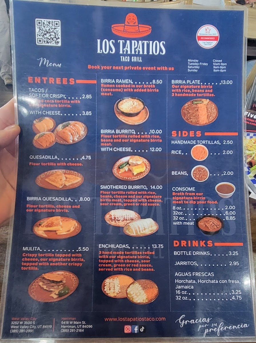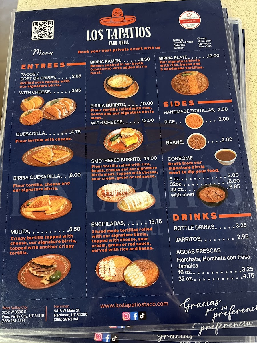 Welcome to Los Tapatios Taco Grill - Herriman, where authentic flavors and a warm atmosphere come together to create an unforgettable dining experience. Located conveniently at 5418 Main St, Herriman, this gem is known for its flavorful entrees featuring handmade tortillas filled with your choice of exquisite meats like their signature birria, asada, or chorizo. Must-try items include their tacos, crispy mulitas, and the kid-friendly quesadillas, all paired with a rich consomé broth for dipping.